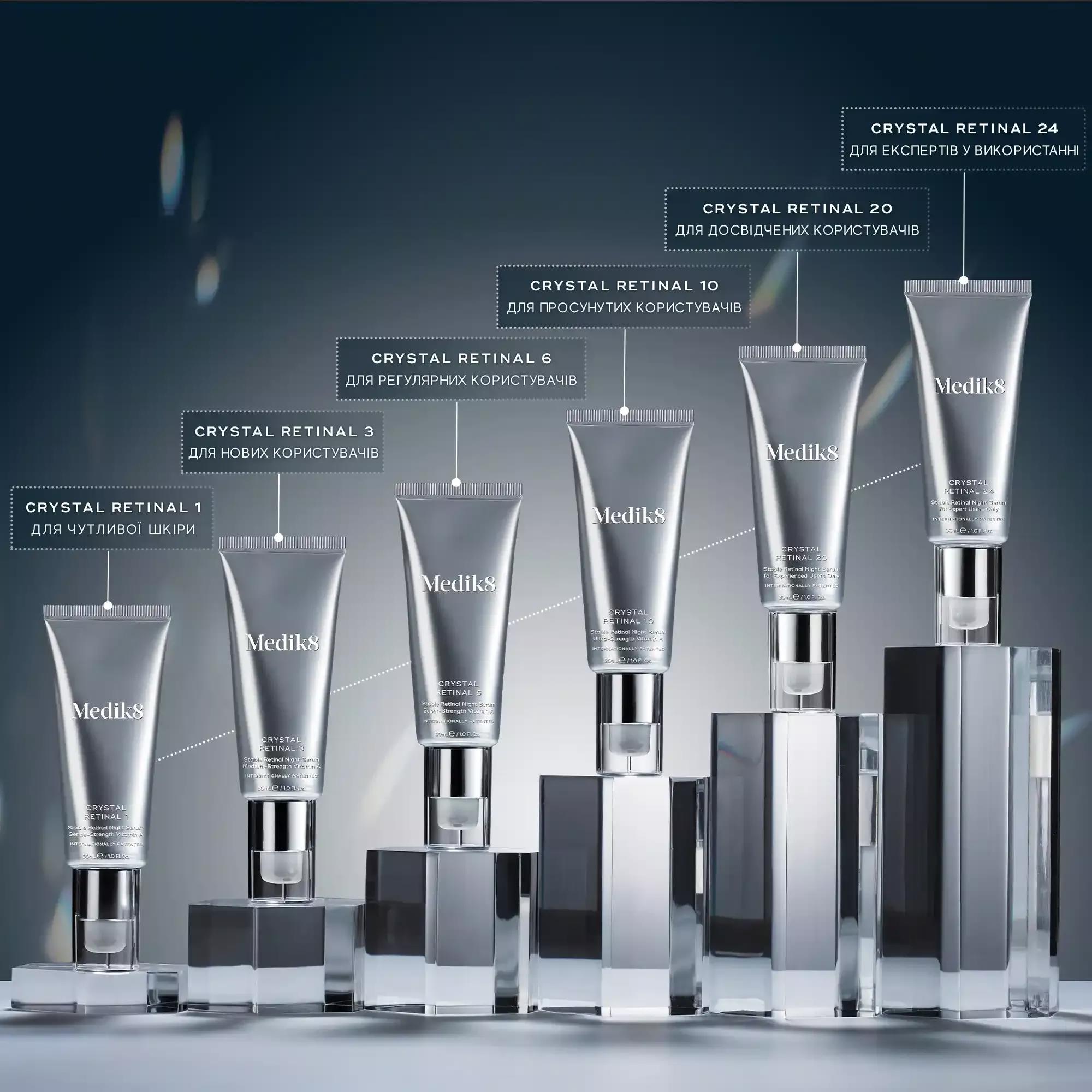 Сироватка Crystal Retinal™ – революційний догляд на основі ретиналю, потужного похідного вітаміну А, який оновлює шкіру, вирівнює тон і зменшує зморшки. Доступна в 6 концентраціях для безпечного та ефективного підбору. 1 тюбика вистачає до 3 місяців при щоденному застосуванні.